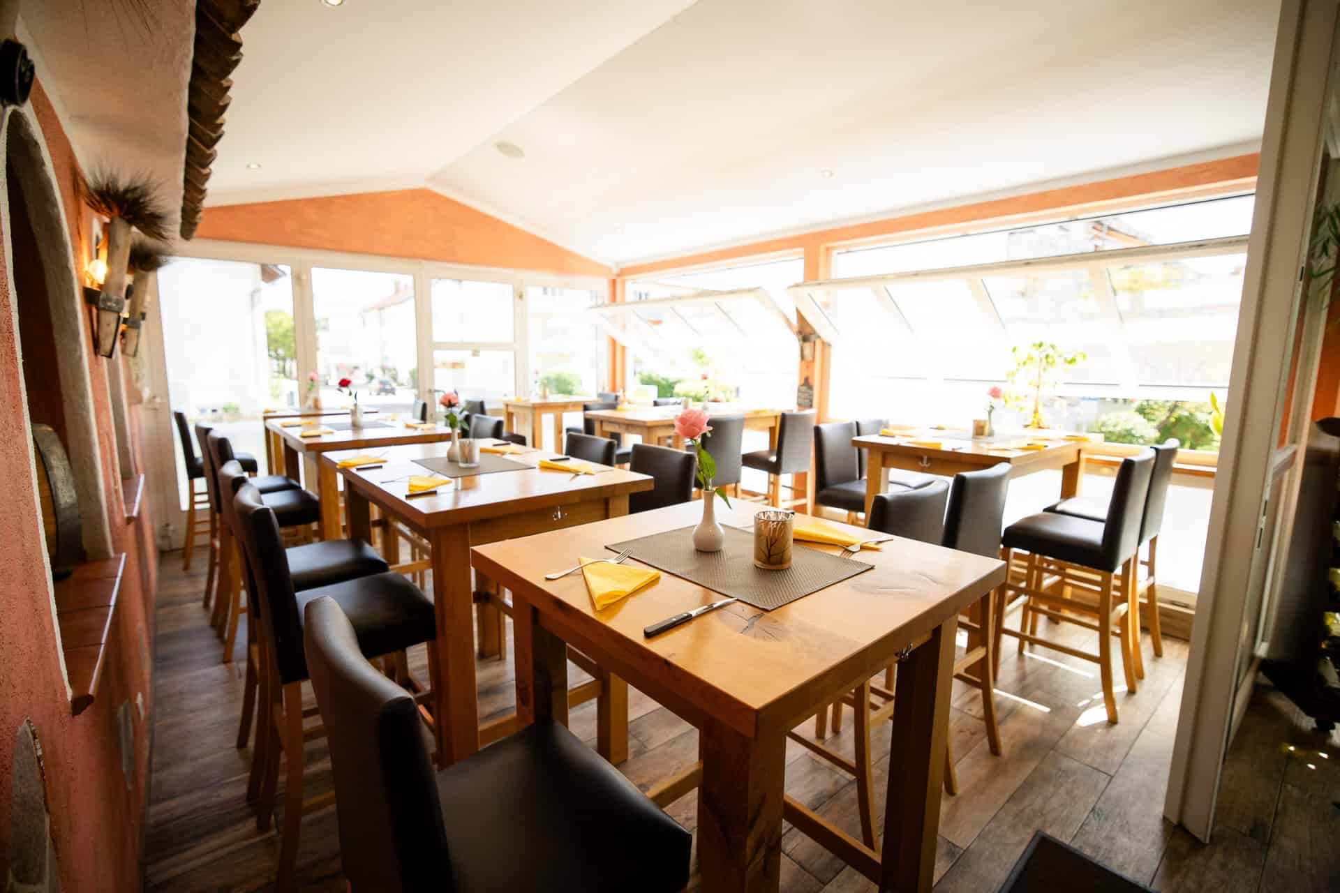 Der Wintergarten besticht durch seine freundliche, lichtdurchflutete Atmosphäre und bietet Platz für bis zu 36 Personen. Er eignet sich ideal für kleine Feiern, Familienfeste oder ungestörte Runden, die etwas Abstand vom lebhaften Hauptbereich wünschen. Ein Ort, an dem man in Ruhe genießen und gemeinsam Zeit verbringen kann.