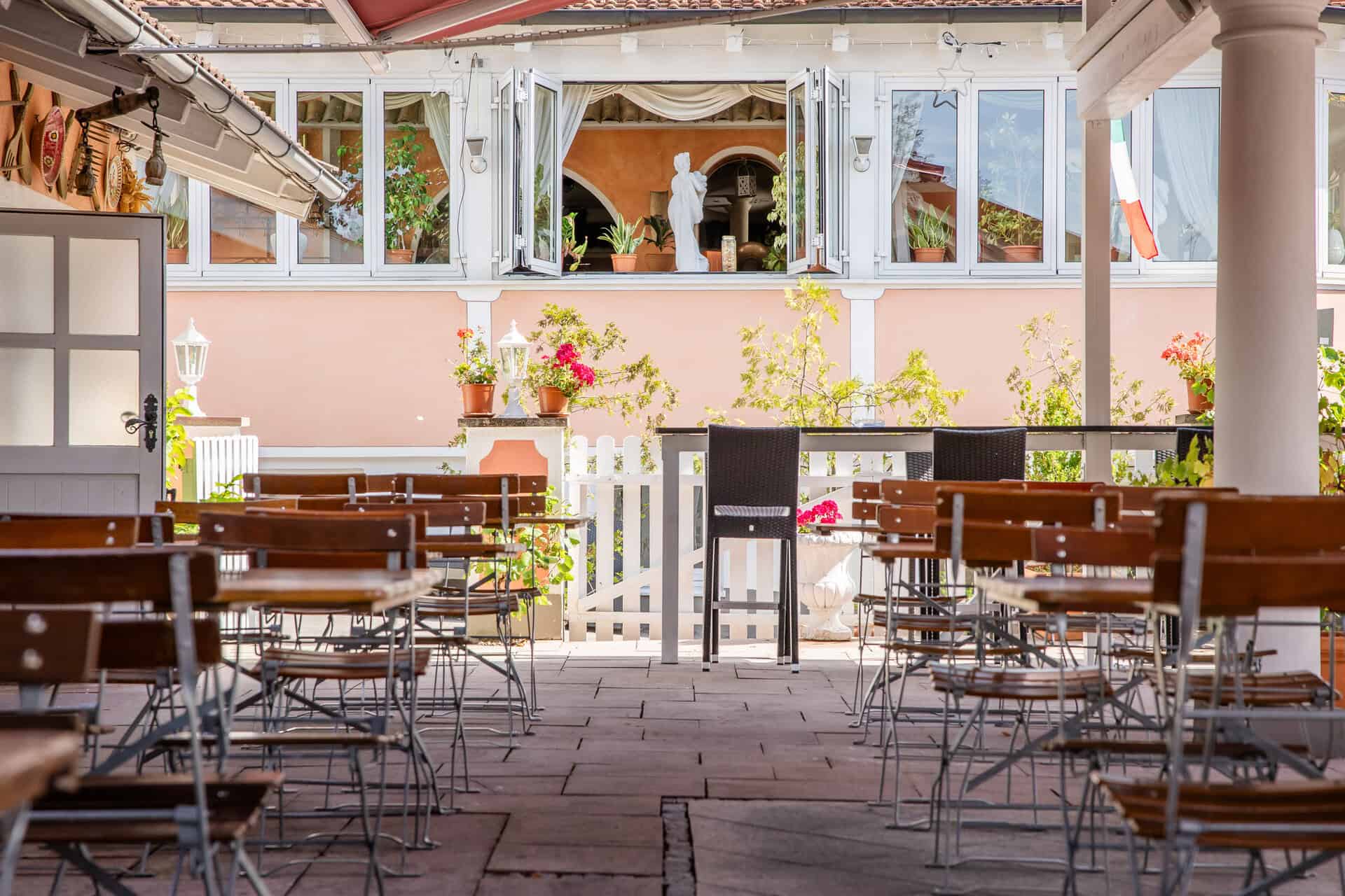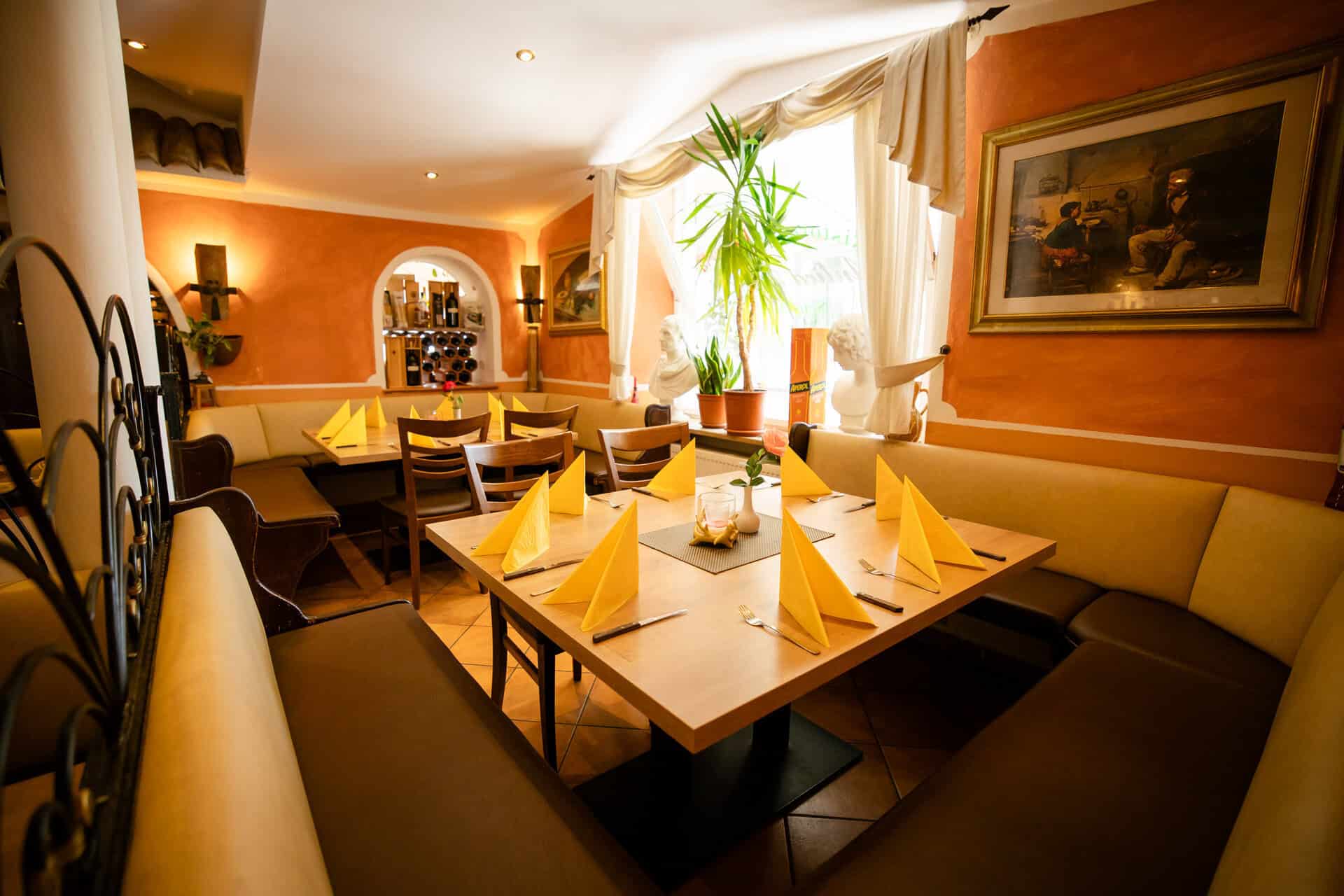 Das Ristorante Antica Rimini bietet verschiedene Räume mit individuellem Charakter – vom lebhaften Centro über die ruhige Vinothek bis hin zum hellen Wintergarten und dem großzügigen Biergarten. Jeder Bereich hat seinen eigenen Charme und lädt dazu ein, italienische Küche in der passenden Atmosphäre zu genießen.